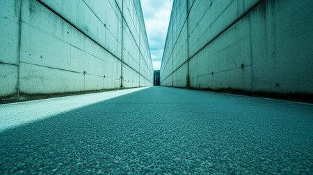 A low-angle perspective shot of a modern concrete corridor. Two massive, textured concrete walls converge towards a distant vanishing point, creating a strong sense of depth and perspective. The ground is a rough, teal-colored textured surface. The sky above is overcast with clouds, casting a diffused light and subtle shadows. The overall aesthetic is minimalist, futuristic, and stark.