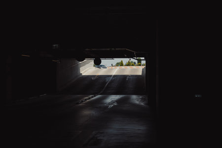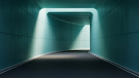 An abstract and futuristic view inside a modern tunnel. The curved walls are a striking teal color, with dramatic shafts of light piercing the darkness and illuminating the smooth asphalt road that curves into the distance. The interplay of light and shadow creates a sense of depth and mystery, the viewer into the unknown. The minimalist and clean lines suggest advanced architecture and a sense of forward motion.