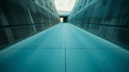 captures a long, straight concrete tunnel or corridor, characterized by its stark, minimalist and strong sense of perspective. The smooth, grey-blue concrete walls converge towards a distant vanishing point, creating a powerful visual pull. The floor is also concrete, reflecting faint light and showing subtle tire marks. The overall atmosphere is futuristic, sterile, and slightly unsettling, evoking a sense of endless passage.