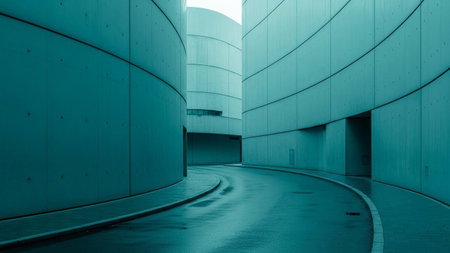 A striking view of modern architecture featuring smooth, curved facades of teal-colored concrete. A wet asphalt road winds through the buildings, reflecting the cool, muted tones of the structure. The minimalist emphasizes clean lines and geometric shapes, creating a sense of serene, contemporary urbanism. The wet surface of the road adds a subtle sheen and depth, enhancing the visual appeal of the architectural forms. The overall impression is one of sleekness and