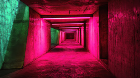 Vibrant pink and green neon lights enhance the structure of a long concrete tunnel, creating an intriguing and surreal environment. The lighting casts shadows that deepen the spatial effect.