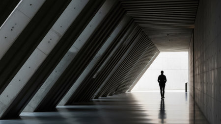 A person is silhouetted as they walk down a concrete hallway, illuminated by bright light at the end. The image showcases repeating geometric shapes and a long perspective. The style is modern with strong contrasts and dramatic lighting. Suitable for editorial and commercial use.