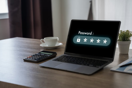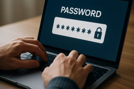 Close up of hands typing password on laptop keyboard to access website or online service, ensuring online security