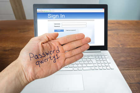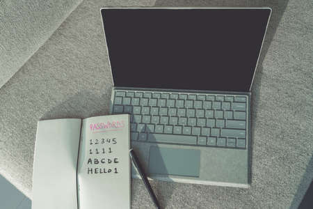 Cyber security. Easy passwords weak security online protection on the web. Laptop computer with handwritten passwords in book