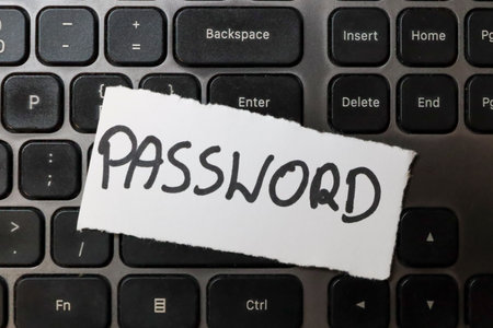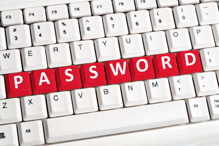 The word PASSWORD is displayed on a torn piece of paper placed on a computer keyboard highlighting cybersecurity concepts and password management themes.