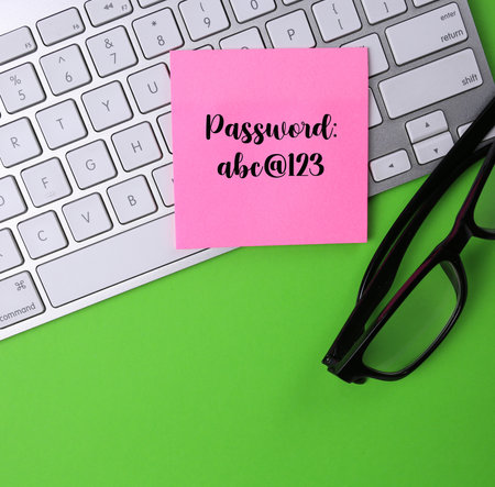 Top view of a keyboard and glasses with password written on an adhesive note