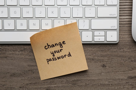 Note with phrase Change your password and keyboard on wooden desk, top view