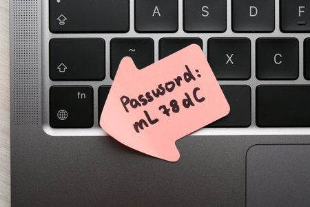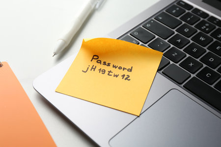 Paper note with password on laptop, closeup
