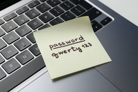 Paper note with password on laptop, top view