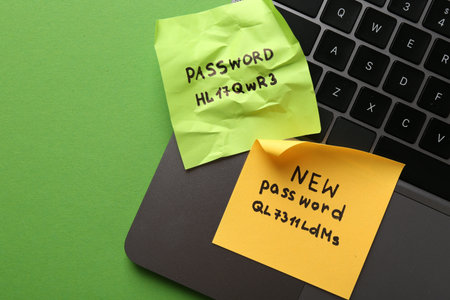 Changing password. Notes with new and old passwords and laptop on green background, top view