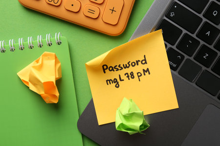 Sticky note with password, laptop, notebook, calculator and crumbles paper on green background, flat lay