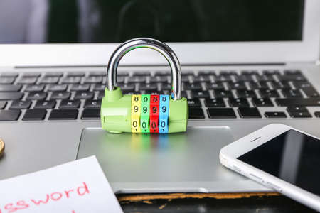 Laptop, phone and lock on table, closeup. Hacking concept