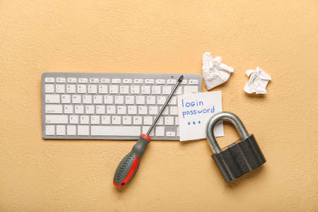 PC keyboard, screwdriver, lock and paper with text LOGIN, PASSWORD on color background. Hacking concept