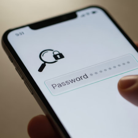 The image depicts a hand holding a smartphone, with the screen displaying a password input field. The field is labeled 'Password' and shows a magnifying glass icon next to a padlock, indicating security. The phone's screen is partially visible, showing a time of 9:31.
