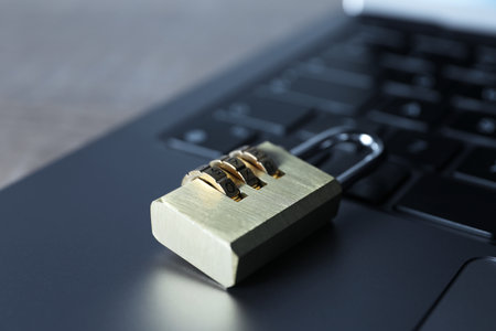 Closeup of padlock on laptop keyboard. Concept of online security.