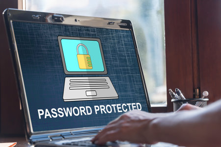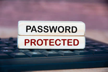 Close up view of text on wooden blocks - Password protected. With blurred locker and laptop background. Password concept