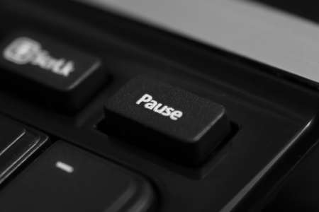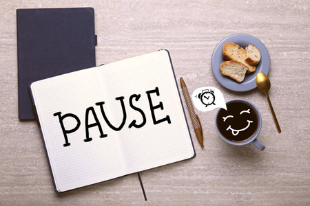 A person holds a card with the word Pause prominently displayed, emphasizing the importance of taking breaks in a modern workspace. Perfect for concepts of rest and productivity.