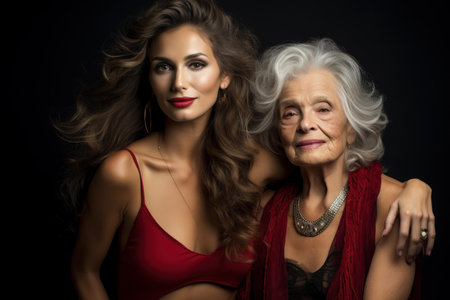 Elegant portrait of a young woman in red and a graceful senior lady, showcasing timeless beauty