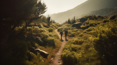 This illustration captures a peaceful mountain path lined with an array of colorful wildflowers in shades of purple, yellow, and pink. The scene is bathed in soft, warm light, enhancing the tranquil mood and inviting the viewer into a serene natural environment. Ideal for use in wellness and relaxation-themed projects. AI-generated illustration.
