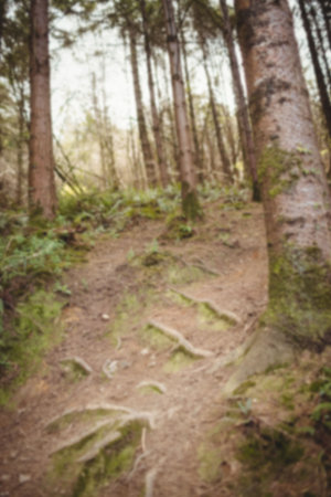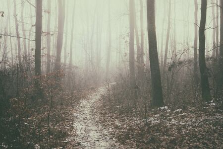 Hiking trail in the misty forest. Beautiful natural landscape.