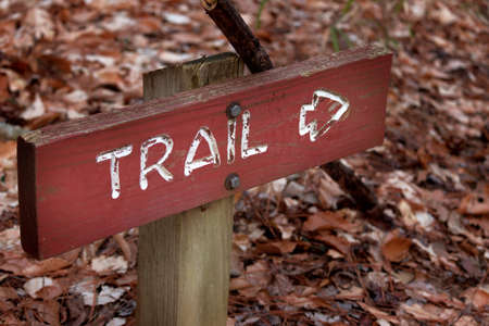 Wooden information signpost in green forest warning hikers to stay on trail and respect wildlife with blurred walking people in background