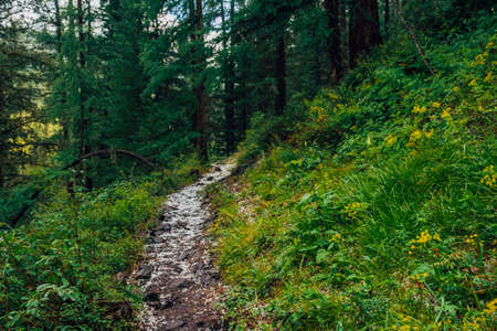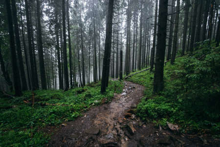Wet footpath through rainy forest. Slush on hiking path. Dark forest landscape with old high pines with copy space. Coniferous trees and vegetation on hill closeup. Mountain atmospheric scenery.