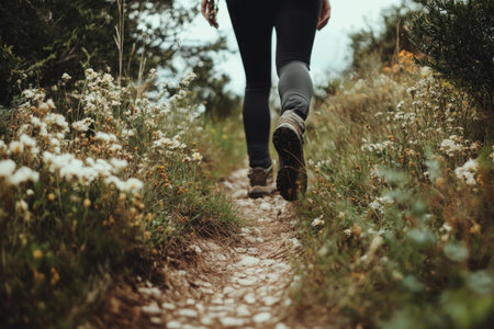 A person walks along a rugged path surrounded by vibrant wildflowers and dense greenery. The trail meanders through a tranquil landscape providing an escape into nature