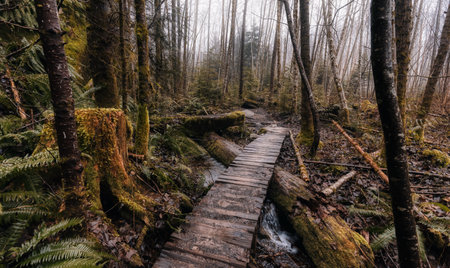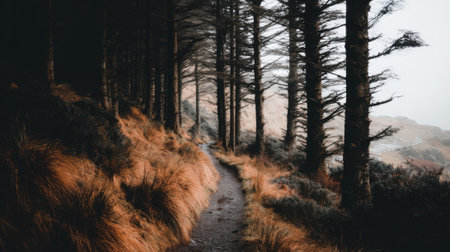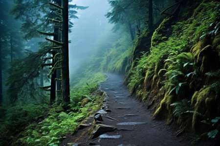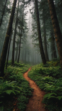Lonely footpath in misty forest symbolizing quiet absence of human presence