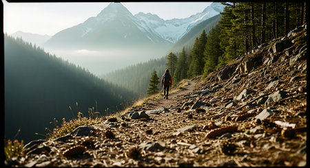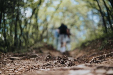 Close up a person's feet walking on rocks , Walking on a trail in the woods , Travel Concept , Generative Ai Technology