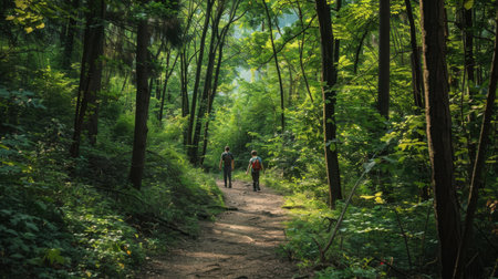 Tranquil scene hiking through lush green forest, exploring nature generated by artificial intelligence