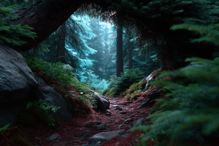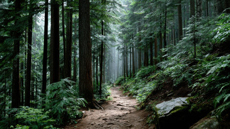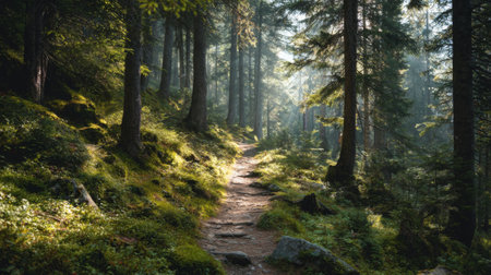 Serene dirt trail winds through dense evergreen forest with vibrant green foliage mossy rocks and dappled sunlight filtering through trees