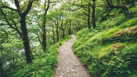A serene pathway leads into a dense forest, surrounded by tall trees and vibrant greenery, providing a tranquil escape into nature.
