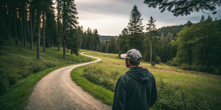 An individual in a baseball cap takes a leisurely stroll on a winding trail glancing at nature around them savoring both the exercise and the tranquility..