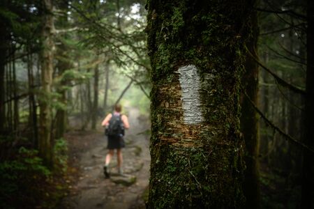 Hiker Passes Appalachian Trail Blaze in summer forest