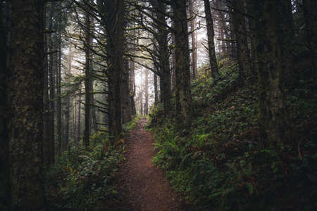Mystical View of the Trail in Rain Forest during a foggy and rainy Winter Season. Woods in Squamish, North of Vancouver, British Columbia, Canada.