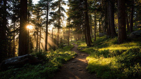 A serene forest pathway invites exploration, illuminated by warm sunlight filtering through tall trees, creating a tranquil outdoor experience.