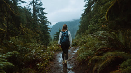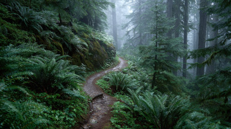 Forest path lined with ferns and morning mist for fresh trail run vibe