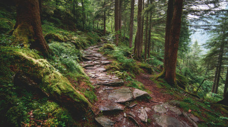 Discover a peaceful forest pathway paved with stones amidst tall trees and vibrant moss. Perfect for nature lovers seeking tranquility and scenic exploration moments.