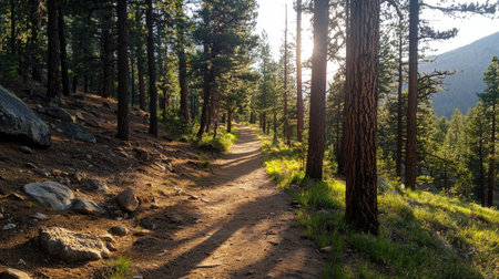 A mountain forest with tall pines and a winding trail, perfect for hiking and exploring nature's beauty