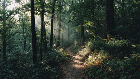 Sunlight filters through the trees, illuminating a tranquil path winding through a lush green forest, creating a serene and inviting atmosphere