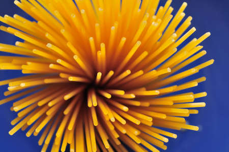 Bunch of uncooked Italian pasta spaghetti on a blue background. Abstract food macro shot, selective focus