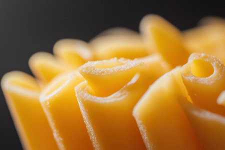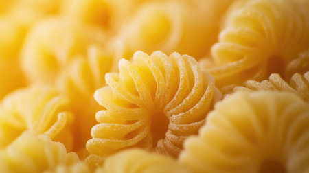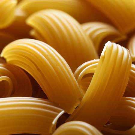 A detailed macro image of raw Cavatappi Cellentani noodles,