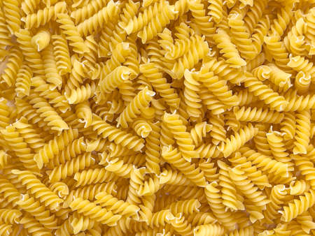 Food background or texture raw dry Italian pasta in shape of spiral. Closeup, macro, top view. Uncooked macaroni