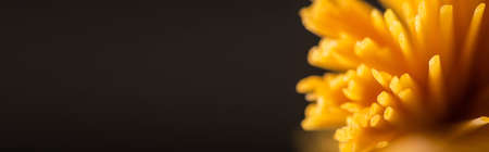 close up view of uncooked Italian spaghetti isolated on black, panoramic shot
