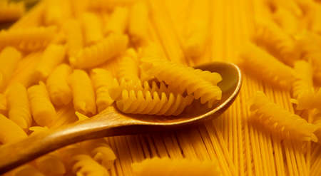 dry pasta, wooden spoon background