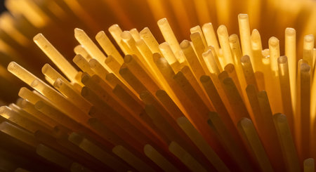 Closeup pile of dry spaghetti, yellow color and great detail.