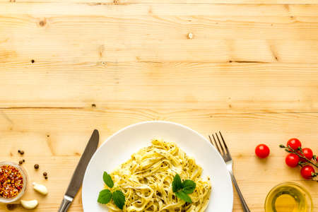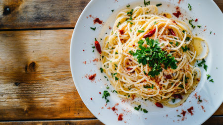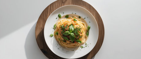 AI Generated. Overhead view of a neatly plated spaghetti dish garnished with fresh herbs on a wooden table