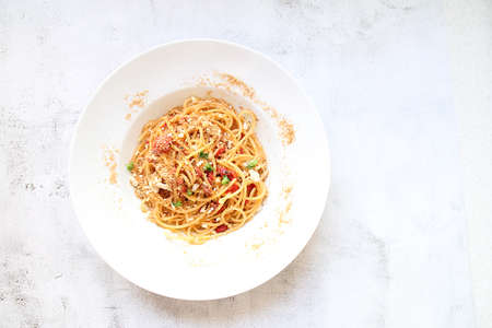 spaghetti spicy with bacon, parsley and parmesan cheese Fresh pepper, Basil leaf . Pasta Carbonara on white plate. Italian food concept.