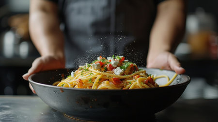 A vibrant plate of spaghetti pasta garnished with fresh herbs and spices. Perfect for showcasing culinary expertise and delightful dining experiences.
