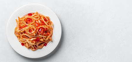 Fresh traditional Italian pasta with linguini with tomato sauce on a gray background. Top view, copy space.